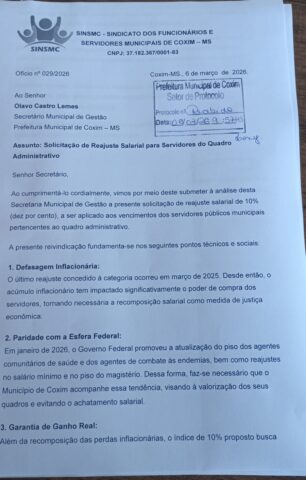 ​O Sindicato dos Servidores Municipais (Sinsmc) oficializou, nesta semana, o protocolo da solicitação de reajuste salarial voltado exclusivamente aos servidores do setor administrativo. O movimento ocorre em um momento estratégico, seguindo as diretrizes estabelecidas em reuniões anteriores com o Executivo.